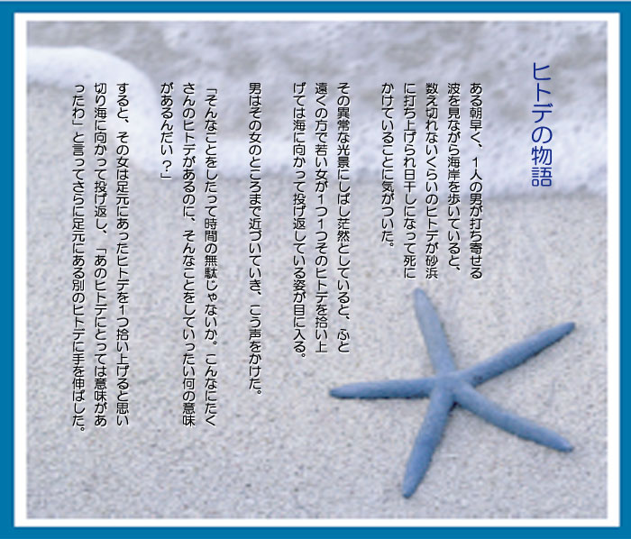 「ヒトデの物語」は、 Life Design Coachingのベースになっている『コーチング・バイブル』- Co-Active Coaching −で紹介されているものです。